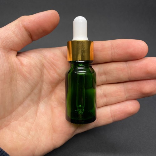 10ml - Yeşil Damlalıklı Cam Şişe - Altın Metal Kapak - Beyaz Lastik